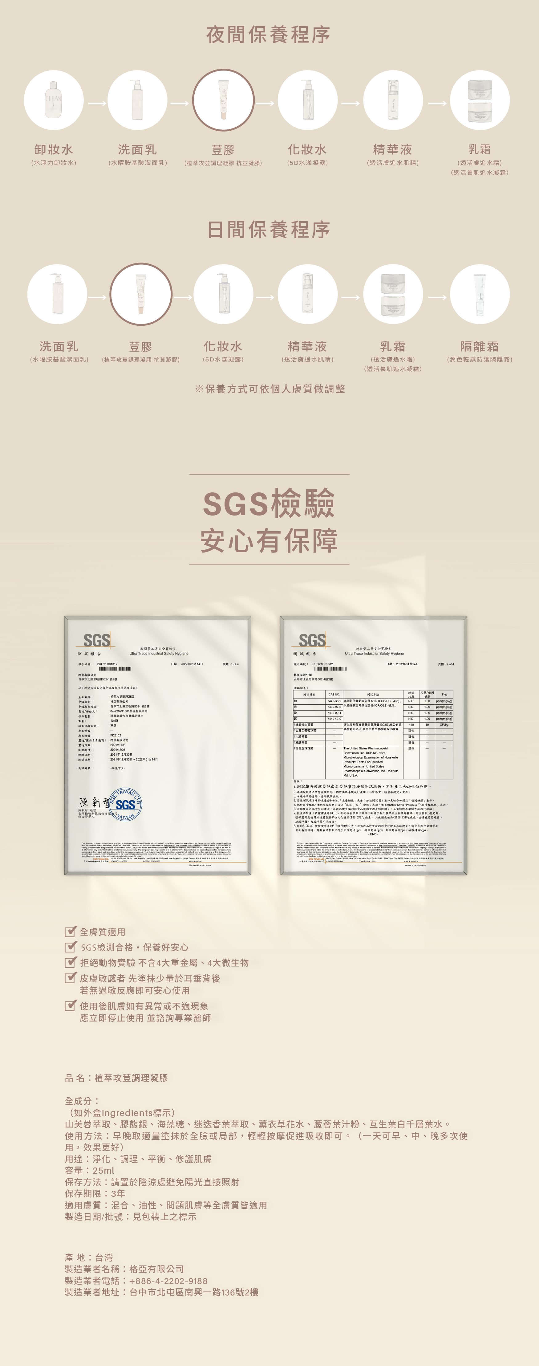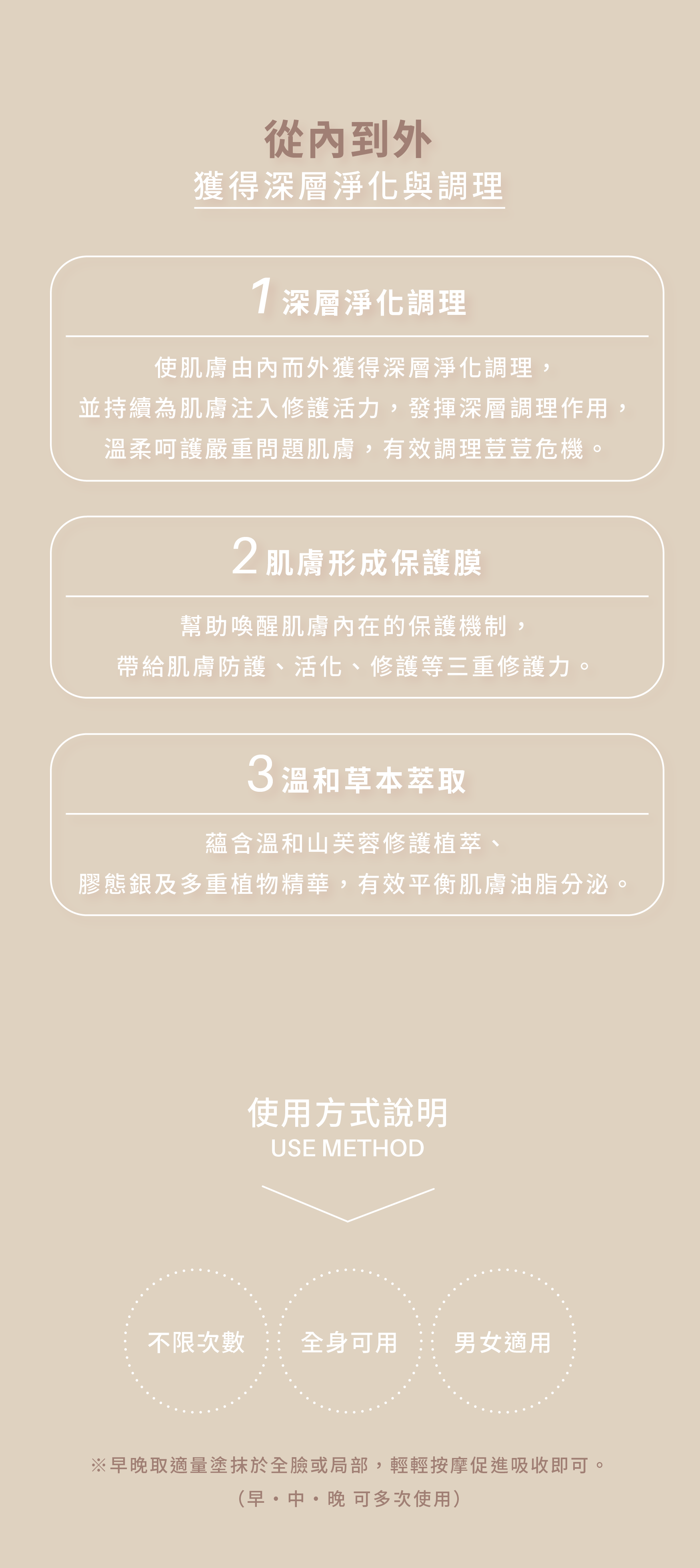 早晚取適量塗抹於全臉或局部,輕輕按摩促進吸收即可。(一天可早、中、晚多次使用,效果更好)