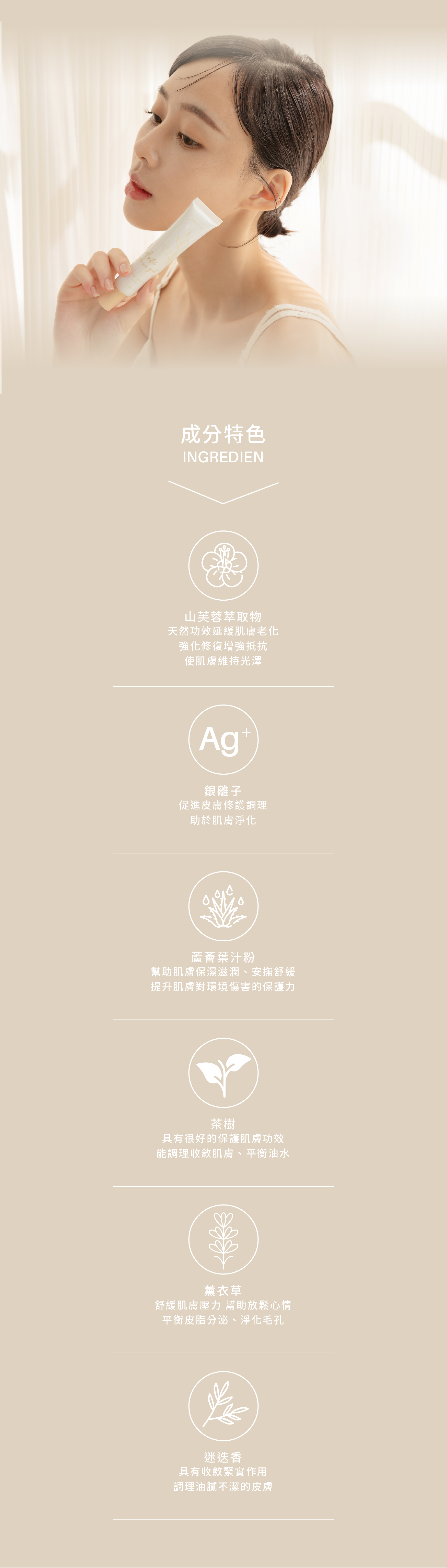 山芙蓉萃取、膠態銀、海藻糖、迷迭香葉萃取、薰衣草花水、蘆薈葉汁粉、互生葉白千層葉水。