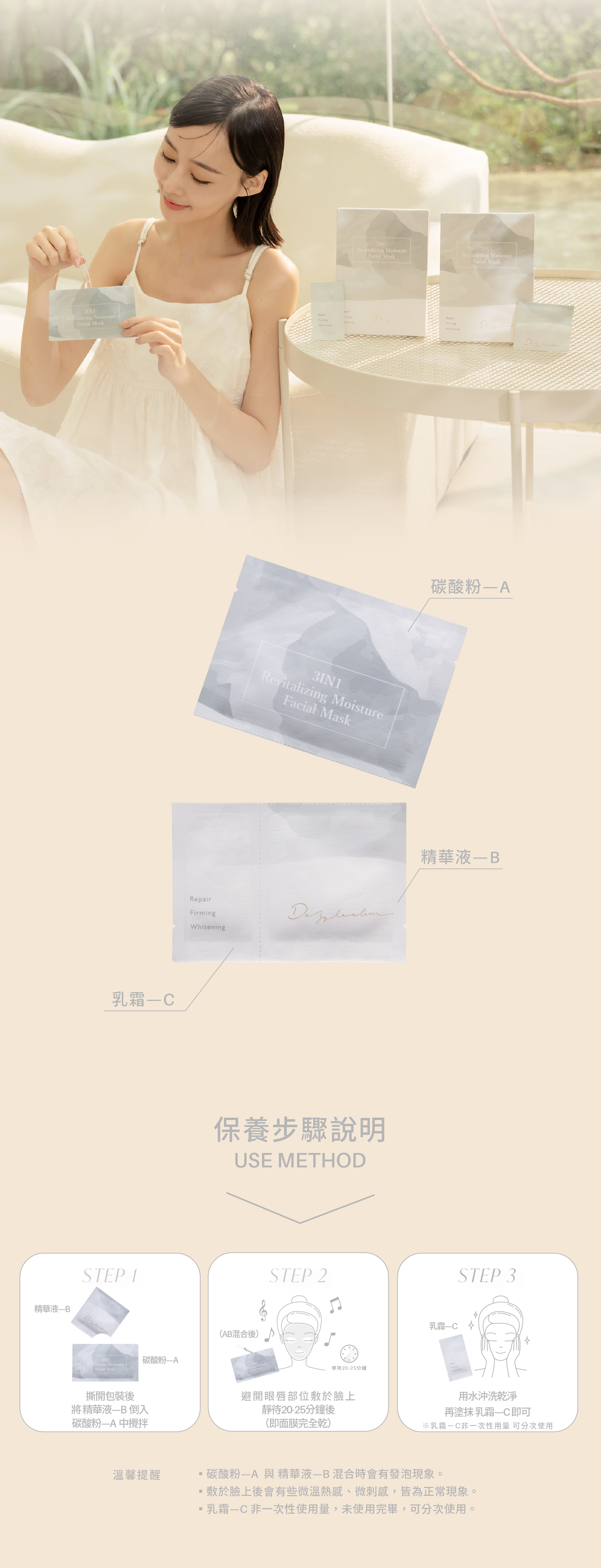 ※ 敷臉期間,能感受強烈的緊膚拉提效果,此時應休息避免說話。