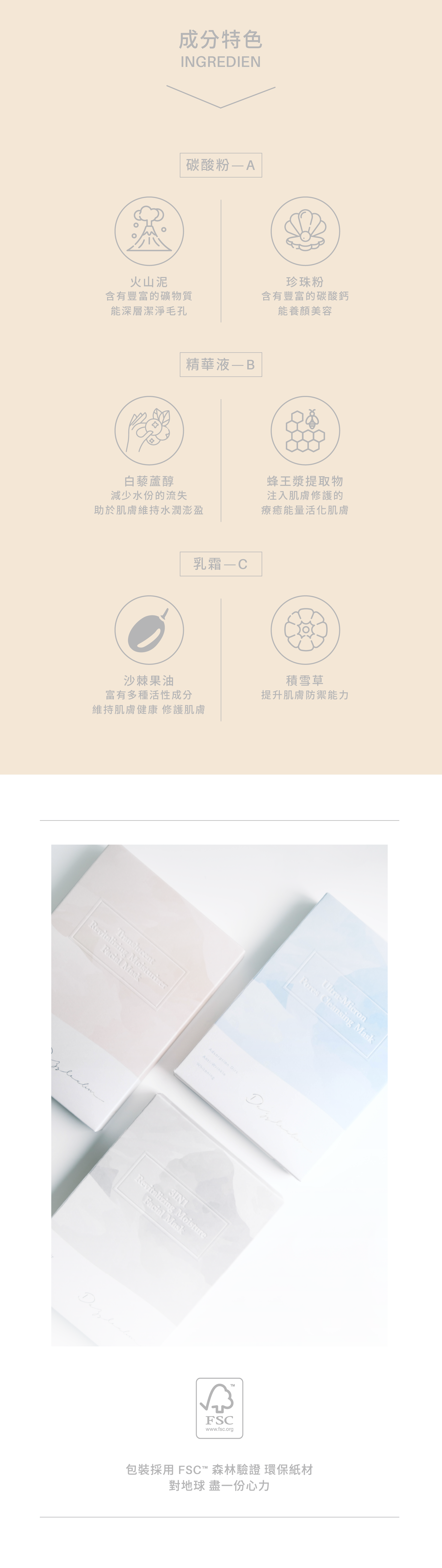 主成分:珍珠粉、膠原蛋白、γ-PGA聚麩胺酸、乙基維他命C、小分子玻尿酸、菸鹼醯胺、碳酸鈉、海藻糖、蘆薈提取物、死海泥、深海泥、火山泥。